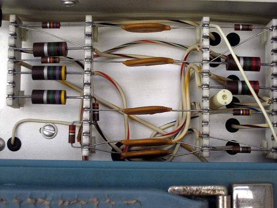 Here you can see the ’B’ intensified by ‘A’ is working nicely. The 547 on the right is monitoring the output of the multivibrator. As the ten turn pot is adjusted to move the intensified portion of the waveform across the screen the duty cycle of the multivibrator changes. If you look closely the removed bad ten-turn potentiometer is sitting next to the role of solder.
