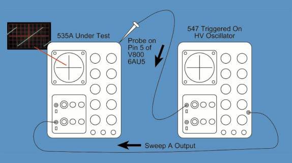 When I got home tonight I set about setting the HV supply to the correct value and confirming if the high frequency ripple imposed on waveforms was from the HV Oscillator. I needed a simple way to phase lock the ripple to the displayed waveform on the 535A. Using my 547 I measured the plate of the HV Hartley oscillator. I triggered the 547 on timebase A so that I could redisplay the sweep output on the 535A. Here is a block diagram of my setup.
