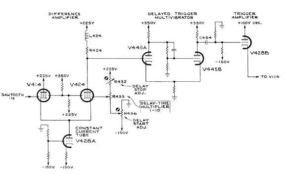 At this point nearly everything is working on the scope. The only exception was the ‘A’ DEL’D BY ‘B’ and the ‘B’ INTENSIFIED BY ‘A’ did not work. I started by reviewing the circuit description of the Delay Pickoff Circuit on page 4-7 of the manual. Operation of the circuit seemed pretty straightforward. A differential amp was created with two 6AU6 tubes for the inputs and ½ of a 6DJ8 as a current source. This dif amp is used as a comparator with the compare point set by a voltage divider consisting of three pots. Two pots set the upper and lower limit of the delay pickoff timing, while the wiper of the ten-turn pot feeds one input of the amp. The other input of the amp is fed by either the ‘A’ or ‘B’ Time base, depending on the front panel settings of the horizontal display switch. Varying the trigger point with the ten-turn pot should vary the duty cycle of the amplifier output. This output is then fed into a multivibrator, read flip-flop, which produces nice square edges on the waveform. A simple RC differentiator feeds an output amplifier that passes only the positive going edges. When I looked at the output of V424 I saw the expected waveform. What surprised me was that the duty cycle did not change with the adjustment of the ten-turn delay pot. After confirming that the saw tooth waveforms from the time bases appeared on the grid of V414 I turned my attention to the grid of V424. No change in the DC voltage when I adjusted the delay pot. Un-soldering and checking with an ohmmeter revealed a ten-turn pot with one open leg. Luckily, the parts bin had a replacement 30K ten-turn pot. Here is the simplified schematic from the circuit description section of the manual.